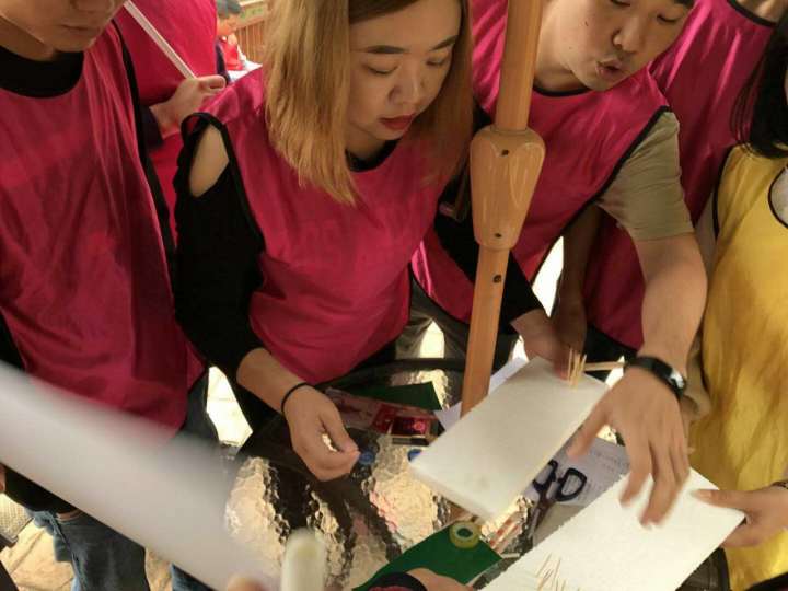 接下來的合力造橋項目,要求兩隊只能運用僅有的一點造橋材料,造出承重結(jié)構(gòu)相同、橋高相等的半個橋體。河面很寬兩隊隊員喊話及做手勢均無法取得溝通,只能利用雙方領(lǐng)隊的衛(wèi)星電話,但受大氣層影響,每隔十分鐘才能成功通話一次,且每次只有短短的一分鐘。為了完成共同的任務(wù),隊員們立刻開始了精心的設(shè)計與施工。盡管教練為項目設(shè)置了種種障礙,但隊員們毫不畏懼,紛紛獻計獻策,突破固有的思維方式,盡自己大的努力去完成目標(biāo)。其實遇到困難不可怕,可怕的是不敢去面對困難,只要我們不放棄,敢于突破自己,改變思維方式,相信只有想不到,沒有做不到,終將實現(xiàn)偉大目標(biāo)。