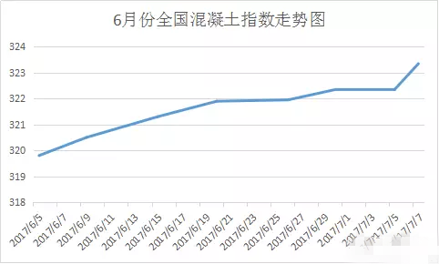 截止07月07日,混凝土價格指數(shù)為 323.35 較06月02日320.75 上漲2.6,較16年同期相比上漲54.9,