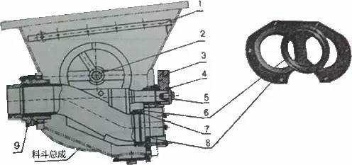 注解:1.篩網(wǎng) 2.攪拌裝置 3.擺臂 4.止轉(zhuǎn)螺釘 5.異型螺栓 6.切割環(huán) 7.橡膠彈簧 8.眼鏡板 9.出料口